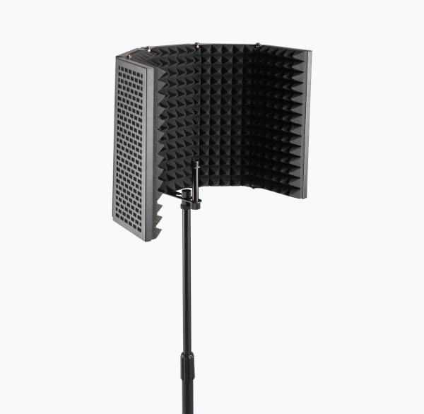 The ASMS3000 Isolation Shield mounts to a standard mic stand, surrounding a microphone’s back and sides with absorbent foam and diffusive screening to reduce background noise and reflections, improving the mic's immediate recording environment. The mounting bracket enables adjustment of the shield’s horizontal distance relative to the microphone, enabling effective placement compatible with a wide range of microphones. Adjustment is quick and simple and settings are locked in with a tightening knob. The shield’s lightweight construction makes it easy for mic stands to support and balance it. For space-saving storage and ease of transportation, the shield folds down to a compact configuration. With its black finish, this versatile accessory adds to the professional presentation of any recording studio or mic setup.